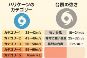 日本もアメリカも風速で強さを分類する事は共通。台風の強さとハリケーンのカテゴリーはどう対応しているのか?風速約18m/s以上から日本では台風というが、アメリカでは33m/sからしかハリケーンと言わない。