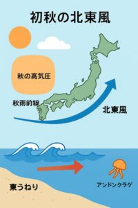 初秋の頃はまだ夏の高気圧が残っているので秋雨前線の南側の南西風が吹く場合もあるが日に日に北東風の頻度が増し、東ウネリがまとまる事がある。