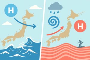 日本海側は風波大荒れサイズアップ、太平洋側はオフショアフラットで乾いた晴天という外れない天気予報。