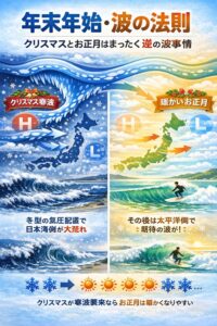 クリスマスが暖かかったら変わりにお正月は寒波がやって来て冬型気圧配置で日本海側がサイズアップするし、鍋底寒気ならば太平洋側も西風が強まり西よりのウネリがまとまる可能性あり。