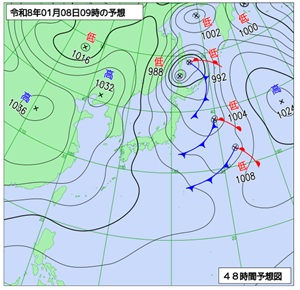 日本列島を挟んで縦に低気圧が二つ並ぶ天気図型は二つ玉低気圧型。三つ縦に並ぶと「三つ玉低気圧」と呼ぶ。