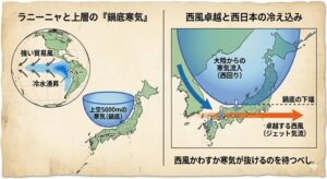 普段暖かなところが冷たくなると世界中の気圧配置がずれ始め、日本付近はシベリア高気圧の寒気が流れ込みやすくなるのがラニーニャの冬。